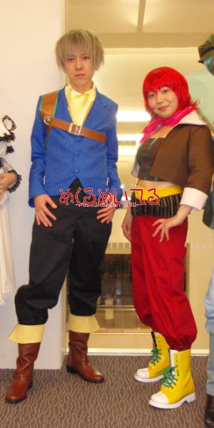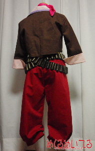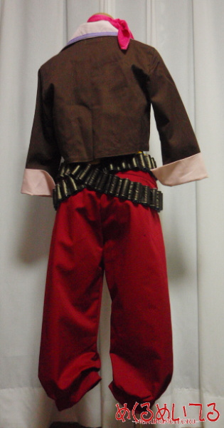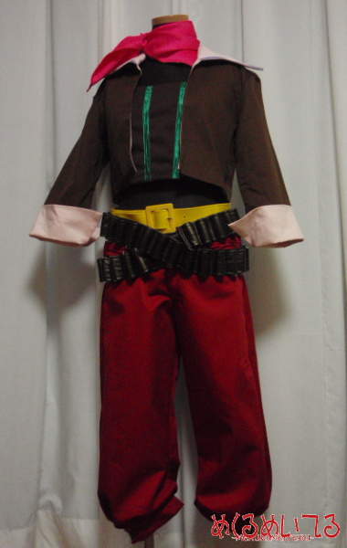 テイルズ オブ イノセンス / イリア・アニーミ ![]() ※写真をクリックすると大きい写真が見れます ■仕様■ ・スカーフ 正方形のスカーフを三角にたたんで結んでいただきます。 シワになりにくくしなやかな化繊素材です。 ・ジャケット 表地には重い綿素材を、裏地には薄いピンクの薄手綿素材を使いました。 襟と折り返し部分にはしっかり芯を張っていますので、 アイロンをあてなくてもシワになりにくく、型崩れしにくいように作っています。 生地の質感にこだわってワイルドな雰囲気に仕上げました。 ・ビスチェ ![]() しっかりしたニット生地で作りました。 胸上の部分に幅広のゴムが入っているのでずり落ちにくくなっています。 縦のラインはサテンバイアステープを使っています。 胸部分にダーツを入れているので、胸のふくらみをつぶさず、 女性的なメリハリのあるラインに見せてくれます。 ご希望に応じて取り外しできる透明ストラップをつけることも出来ます。 ・ベルト 黄色いエナメルのベルトです。 バックルも黄色いプラスチックの物を使いました。 幅広なのでウエストの細い部分より少しずらしてつけると、かなり腰を細く見せてくれます。 ・弾帯風ベルト ![]() 実際の弾は入っていませんが、中にチューブを入れて立体感を出しています。 くすんだ金色の合成皮革で作りました。 ボリューム感と存在感があるベルトです。 マジックテープで固定し、テープのつく部分(弾入れループのない部分)で2本のベルトを交差させます。 ホルスターを下げることも出来ます。 ・パンツ すぼまった裾の部分に金属の飾りボタンの付いた膝下丈のパンツです。 腰履きできるよう股上を浅めに作ってあります。 ワイドにつくっているので、腰を細く、脚をすらっと見せてくれます。 風合いが良くシワになりにくい混紡生地で製作しました。 ※製作の一例です。お客様のお好みに応じて素材の変更、細部の追加・省略ができます。 専用ウィッグや専用ブーツカバーの製作も承ります お見積り依頼、ご注文はこちらまで t-yanagi@mekurumeiteru.net 【コスチューム着用例】 ![]() 当店スタッフ:渡辺 |